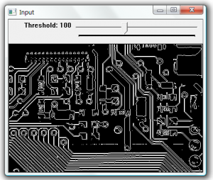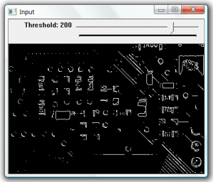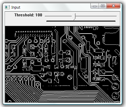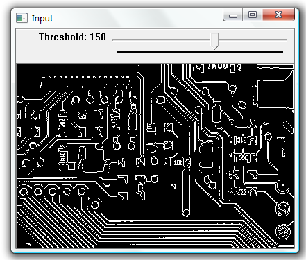 In this example we threshold the image based on the position of the track bar. Then find contours on the image an display the contours as white lines.